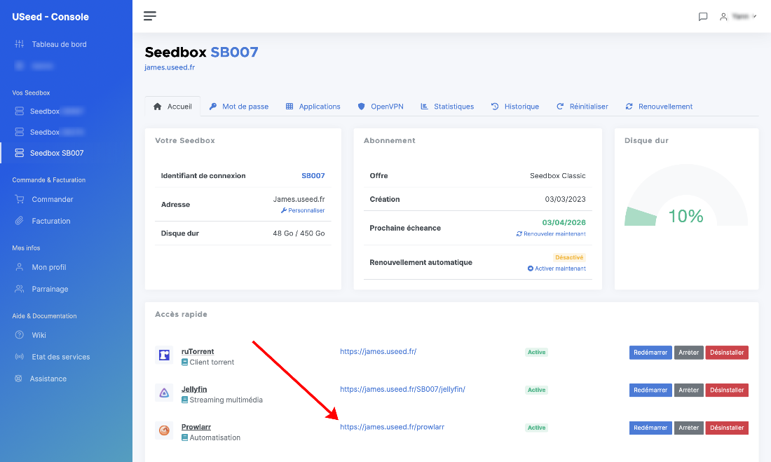 Rendez-vous dans votre compte USeed, puis menu de gauche (icône en haut sur mobile) et choisissez votre Seedbox puis cliquez sur le menu "Applications".
