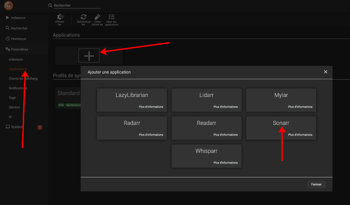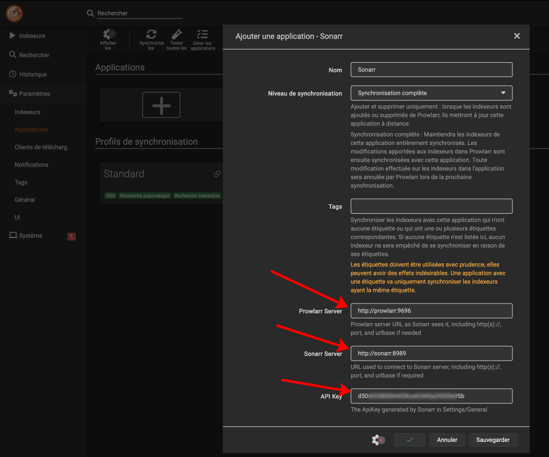 - API Key : ***** (La clé API est dans l'interface Sonarr : “Paramètres” → “Général" → “Clé API”)